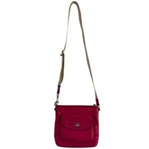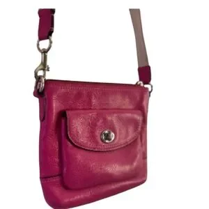 Chic and stylish pink leather crossbody bag perfect for any occasion. Features a secure clasp and adjustable strap for comfort.