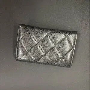 Authentic Chanel black caviar leather quilted flap card holder / compact wallet with black CC logo hardware.