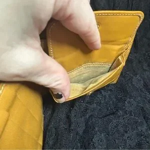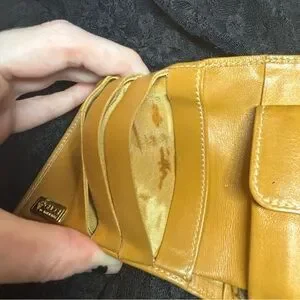 The interior leather is clean and vibrant, with small dark spots on some card-slot linings. The coin pouch with snap closure works properly and shows expected coin residue.