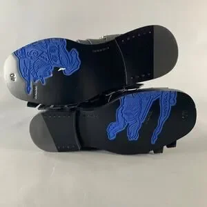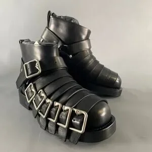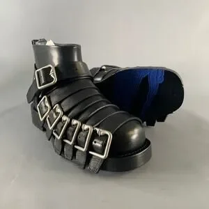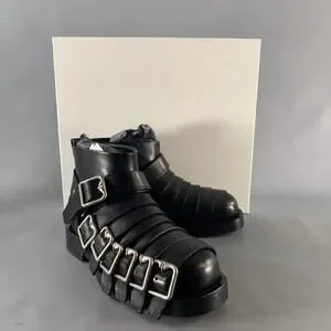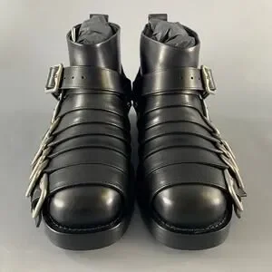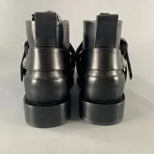 Burberry ankle boots for men feature a sleek black leather construction and a modern pull-on design. Highlighting a unique multi-belt aesthetic. Made in Italy.
