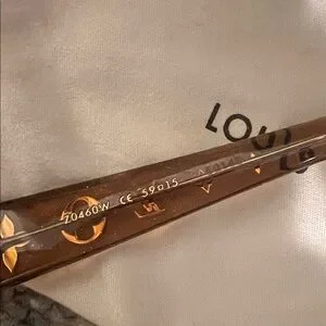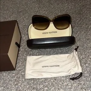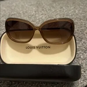 Like new! Authentic LV sunglasses. The are a brown glittering clear color with gold logos. Looks like brown lenses. They will fit a petite face better. I’ve posted to sizes in the pictures. Everything is included with purchase.