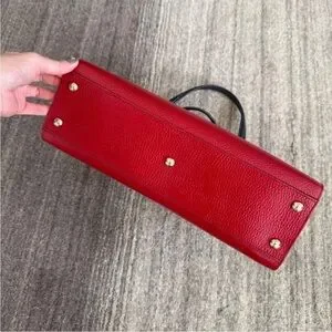 Chic red leather satchel with black handles. Iconic Gucci design. Perfect for everyday elegance.