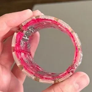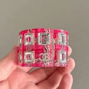 CHANEL Pink Tweed Inlay Crystal CC Cuff Bracelet. Silver hardware. From 2014. Magnetic closure.
