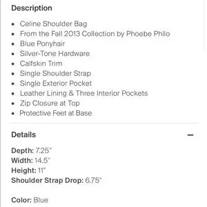 I personally purchased this bag at the Celine in Woodbury Commons New York. All original tags and original dust bag are included. Only the dust bag has a small black mark from being moved around in my closet. It was stored stuffed to keep the shape.
