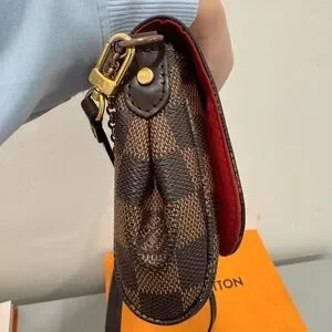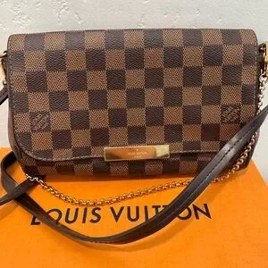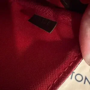 This is an authentic LV Damier Ebene Favorite PM is in excellent condition. The only signs of wear is the minimal scratches on the frontal name plate in brass as shown in photos and mild discoloration of the red fabric on the inside of the bag (no stains).