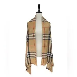 Features iconic beige check pattern with subtle woven Burberry logo details and fringed edges. A timeless designer accessory that elevates any outfit.