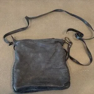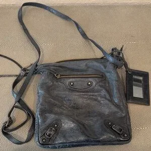 Balenciaga black leather crossbody bag. Features front zipper and adjustable strap. Comes with small black leather mirror. Some signs of wear with discoloration and frayed straps, but fully functional and perfect for everyday use!