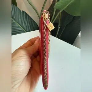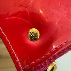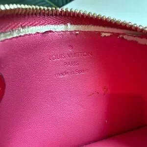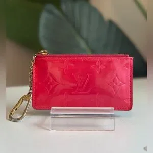 Louis Vuitton Monogram Vernis Pochette Clés, a versatile key pouch and coin purse. It is made from patent leather embossed with the signature Louis Vuitton monogram pattern. The specific color of this wallet is a vibrant pink red hue, often referred to by the brand as "Pomme D'Amour" or “Fuchsia".
