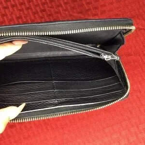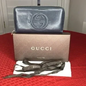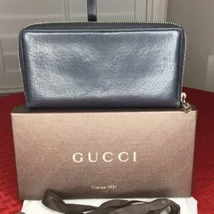 Elegant Gucci wallet in dark blue leather. Features embossed logo and zip-around closure. Has rubbings on corners. Zippers work fine. No holes, tears or smells. Inside looks good. Hardware is gold. Please see pics and ask questions. Comes with everything in picture.