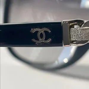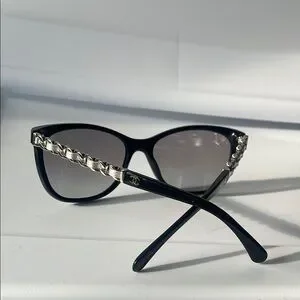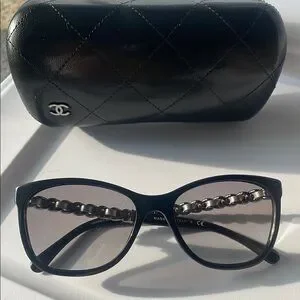Stylish CHANEL sunglasses. Black frames with chain accent. Includes elegant case.