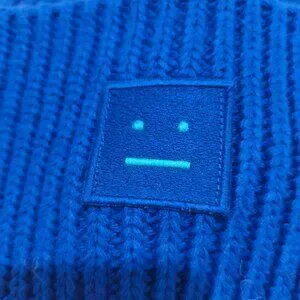 The blue square patch on the front of the hat is embroidered with Acne Studios' classic ""expressionless face"" motif.