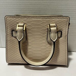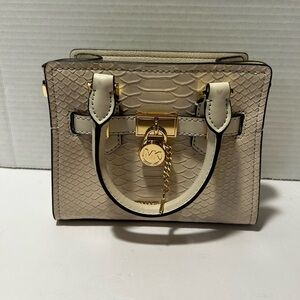 Michael Kors Hamilton Extra-Small (XS) Satchel with a snake-embossed finish in a light cream or natural color. This mini bag features gold-tone hardware, including the signature MK lock and key
