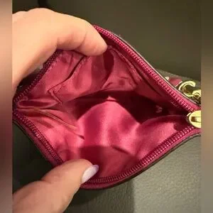 Elevate your style with the Coach Raspberry Wristlet Clutch. This chic accessory features a vibrant pink design, perfect for adding a pop of color to any outfit. Crafted with quality and elegance, it's a must-have for any fashion-forward wardrobe.