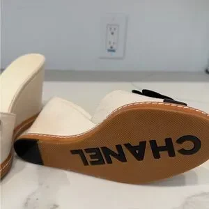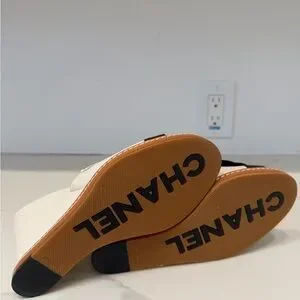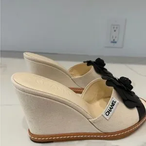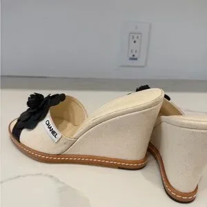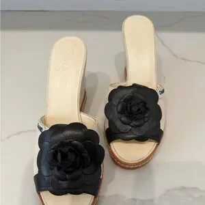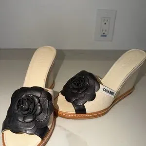 Step out in effortless style with these gorgeous black camellia CHANEL flower wedge slide sandals 🌸