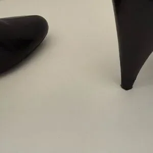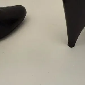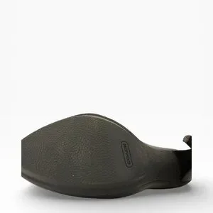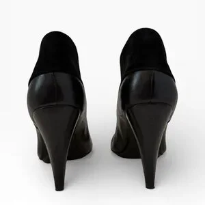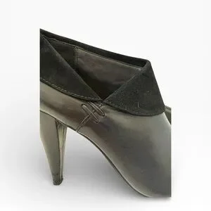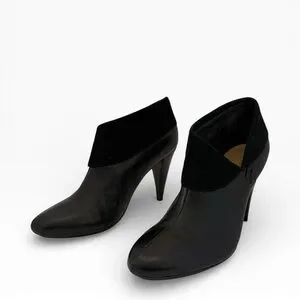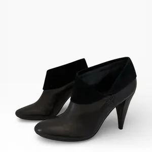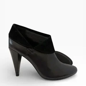 Elegant Coach ankle bootie heels in classic black leather with suede collar detail. Sleek pointed toe and slim stiletto heel make these perfect for office wear, evenings out, or polished everyday styling. Timeless, minimal design that pairs with everything.