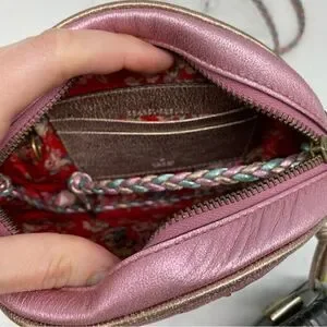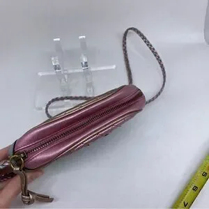 Zipper closing. Braided strap. Pink and green tones.