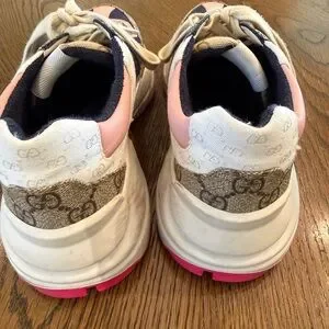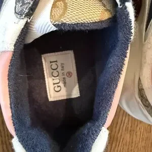 Chic Gucci sneakers for kids. Features pink and blue accents. Ideal for playful days.