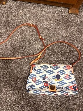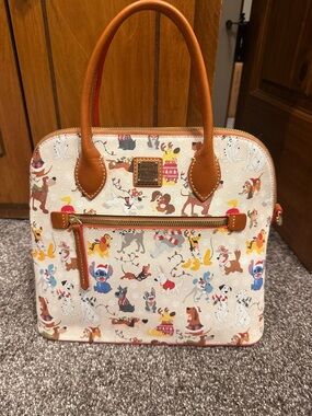 Stylish handbag featuring Disney characters. Brown and tan design with playful accents.