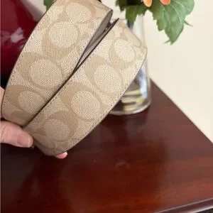 NWT Coach Signature adjustable guitar strap in Light Khaki/Chalk. Goldtone hardware. 5 holes on each end to adjust to desired length.
