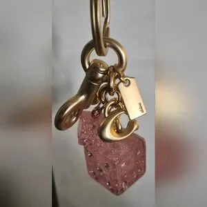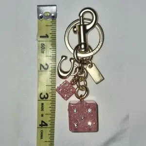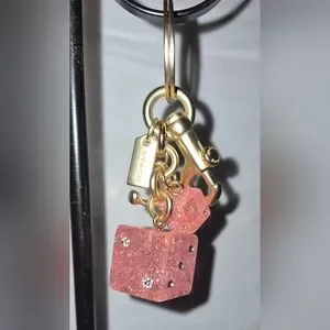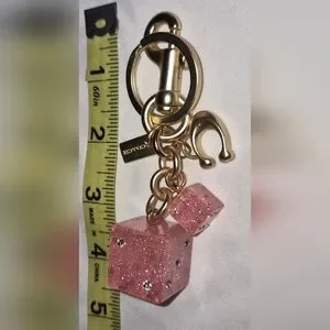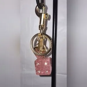 -sparkly pink resin dice with crystal accents, signature "C" charm, brushed light gold hardware, keyring, and