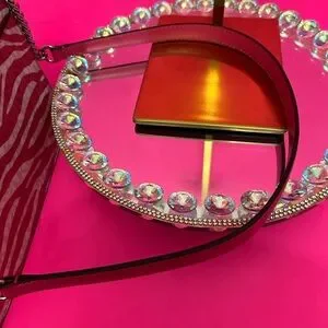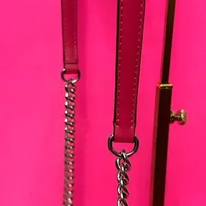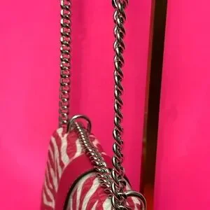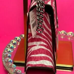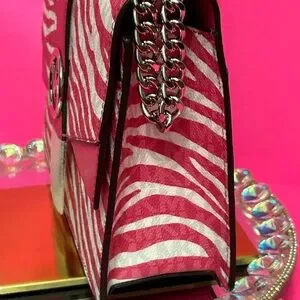Stylish crossbody bag with zebra pattern. Features bold pink and white design. Iconic MK logo on front. Chain strap for easy carrying.