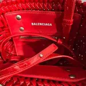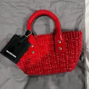 Stylish mini bag with a glossy red finish. Perfect for a bold fashion statement. Features a unique woven design. New with dust bag