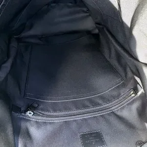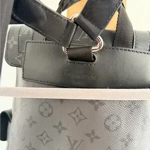 Stylish gray backpack with iconic monogram. Features secure buckle closures. Ideal for daily use.