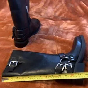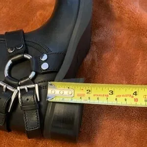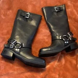 Stylish black boots featuring bold buckle details. Ideal for a chic, edgy style.