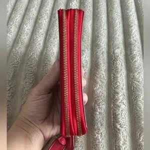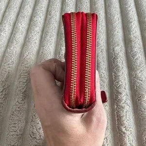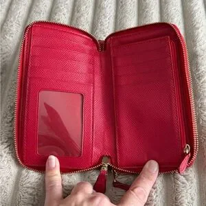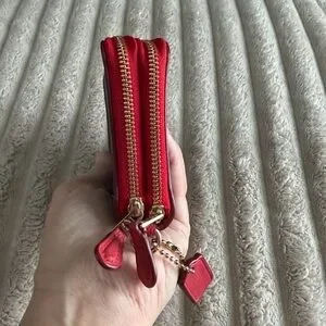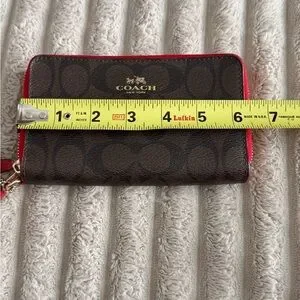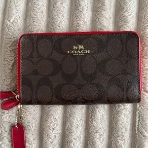 Elegant Coach wallet with signature pattern. Features rich brown and vibrant red accents. Ideal for stylish organization.