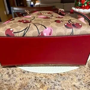 Chic Coach tote with playful cherry design. Features tan background with pink accents. Perfect for any outfit.