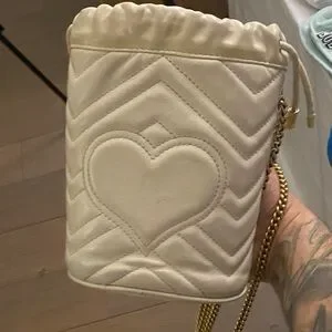 Chic cream mini bag with iconic gold Gucci logo. Stylish quilted design. Ideal for any occasion.