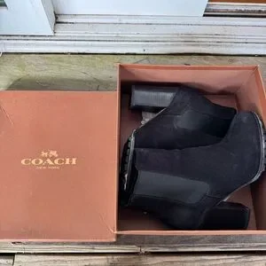 Chic black heeled boots by Coach. Sleek design with a comfortable fit. Ideal for stylish outings.