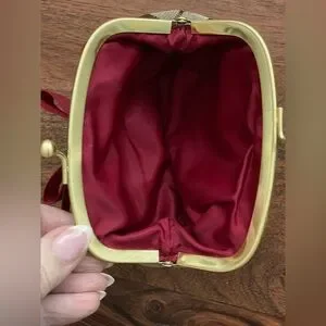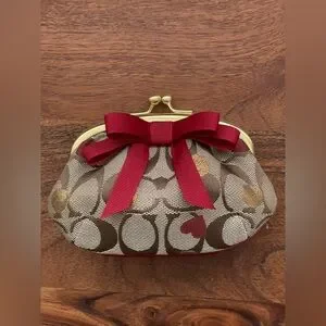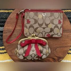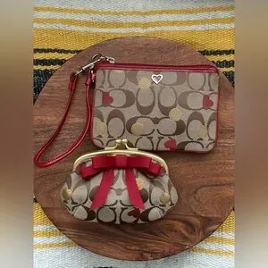 This sweet set includes a wristlet and Kisslock coin purse. Both are signature tan jacquard with gold polka dots and red hearts. The wristlet has red patent trim and silver hardware. Zip top closure. The coin purse has a sweet red grosgrain ribbon bow and gold tone hardware.