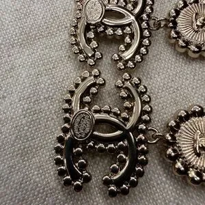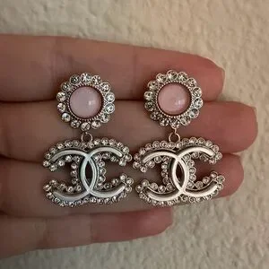 Stunning CC logo drop earrings featuring soft pink cabochon studs surrounded by clear crystals. Each earring suspends an interlocking CC motif accented with crystal detailing. Elegant movement with a refined, feminine look. Extremely pretty post back closure/ excellent condition.