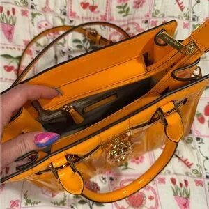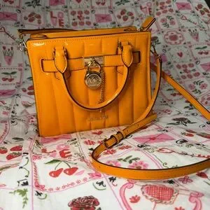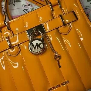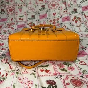 Glossy patent leather orange satchel with signature lock charm. Elegant and eye-catching design. Perfect for adding a bold touch to your look.