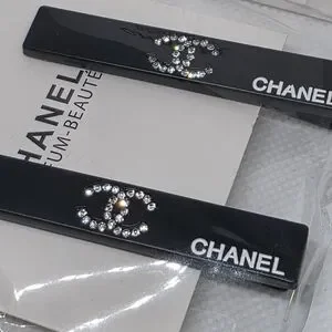 Stylish black hair clips adorned with sparkling crystals and the CHANEL logo. Ideal for a chic hairstyle.