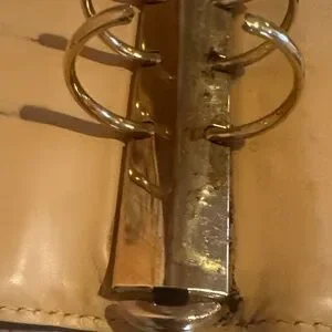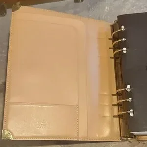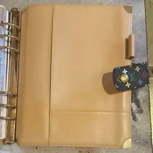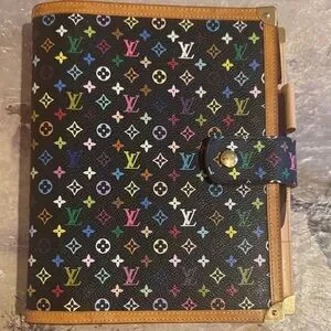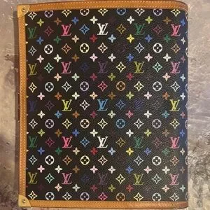 2007 collection -multicolor monogram on black canvas. Gold-tone button closure. Tan leather accents.