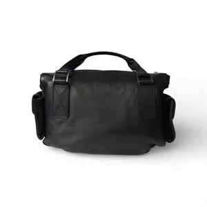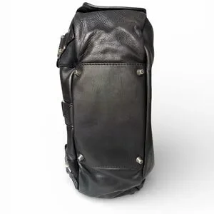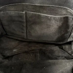 The exterior boasts buttery soft leather and suede with a silver hardware accents. Definitely a heavy duty bag. Front pocket is deep with a hook enclosure. Side pockets have a magnetic closure with a belt type look.