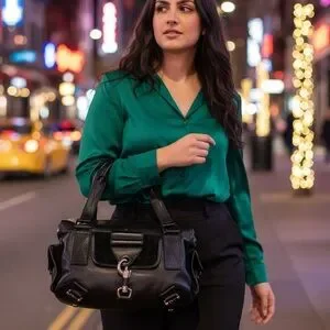 This stylish black leather and suede accent handbag is perfect for any occasion. Its sleek design and high-quality material make it a must-have accessory.