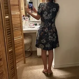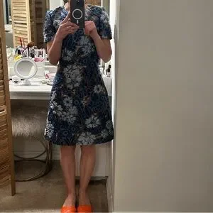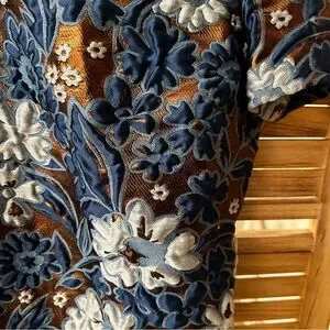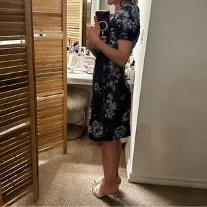 Over the knee length, short sleeves, crew neck, back zipper, floral embroidered print