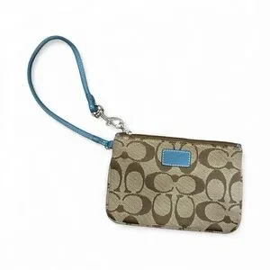 Stylish Coach wristlet in a chic brown and blue design. Perfect for carrying essentials with ease and elegance.