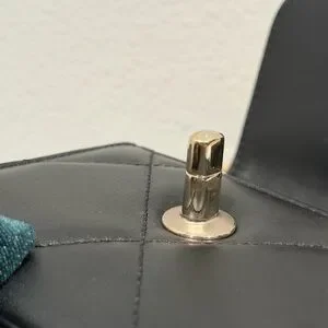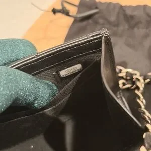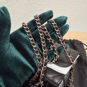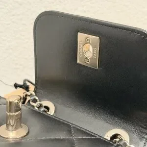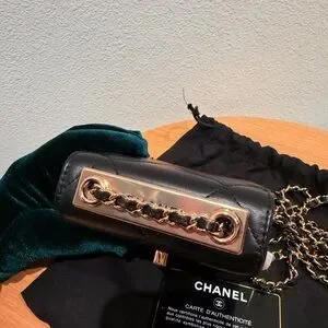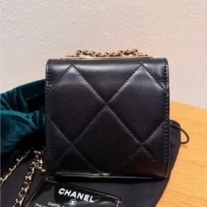 Chanel mini bag in sleek black with iconic gold logo. Features a stylish chain strap. Perfect for adding elegance to any outfit.