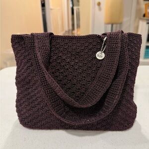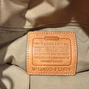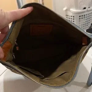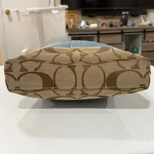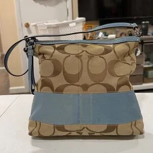 Coach Signature C brown canvas blue striped leather trim shoulder bag