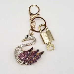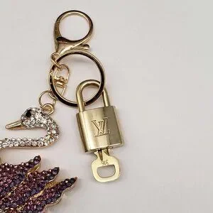 Elegant swan keychain featuring a stylish Louis Vuitton padlock charm. Perfect for adding a touch of luxury to your accessories.