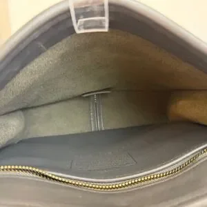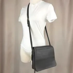 FEATURES/ACCENTS: Very Clean & Soft, Glove-Tanned Grey Leather. Magnetic Flap Closure. Brass Buckle on an adjustable crossbody strap. Interior Zip Pocket, Outer Slip Pocket. Original Grey Hang tag