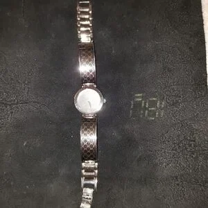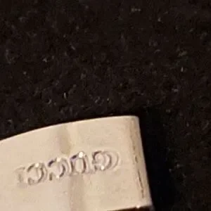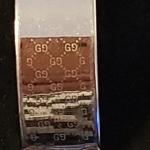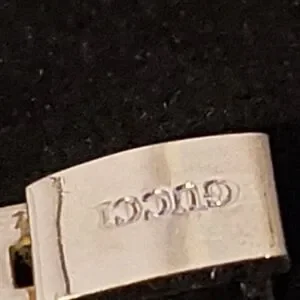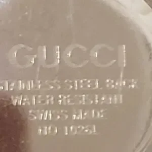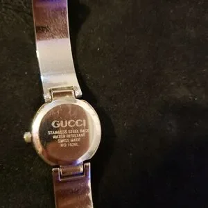Elegant Gucci watch with a silver band and black face. Features a sleek design. It works battery is good and is in great condition.