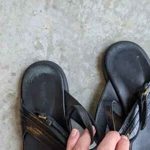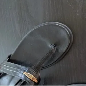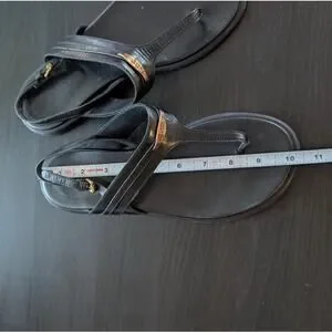 - 100% leather calfskin, gold metallic logo, T-strap, heel strap with buckle, rounded open toe, leather insole with logo, flat rubber sole