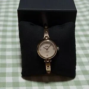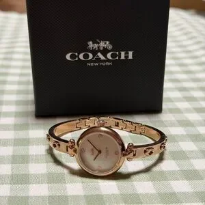 Elegant Coach watch with a gold-tone finish. Features a round face and stylish bracelet.