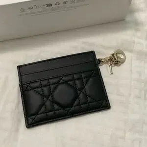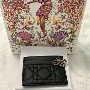 This Dior wallet showcases a sophisticated black quilted leather design, offering a timeless and luxurious appeal. Its compact form is perfect for carrying essentials with style and elegance.