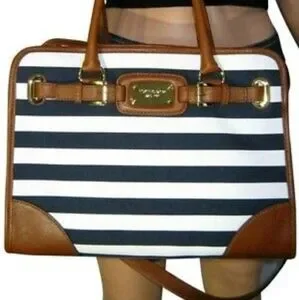 Stylish tote with navy and white stripes. Features brown leather accents. Perfect for everyday use.